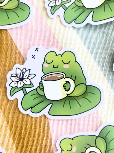 Pegatina de vinilo divertida de rana con taza de café decorativa para scrapbook y regalo estilo kawaii