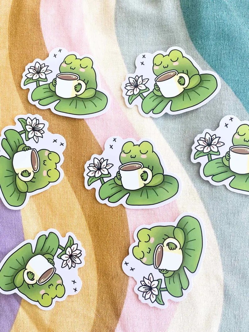 Pegatina de vinilo divertida de rana con taza de café decorativa para scrapbook y regalo estilo kawaii